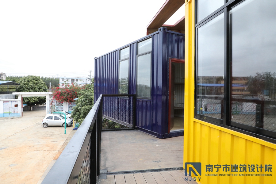 項目采用了集裝箱房屋的形式,由10個(gè)集裝箱構成,通過(guò)堆積木的形式,根據學(xué)生兒童所需的建筑風(fēng)格和功能需求,將集裝箱橫豎排列,形成一定的退臺和露臺空間,為孩子們提供更多共享活動(dòng)空間。